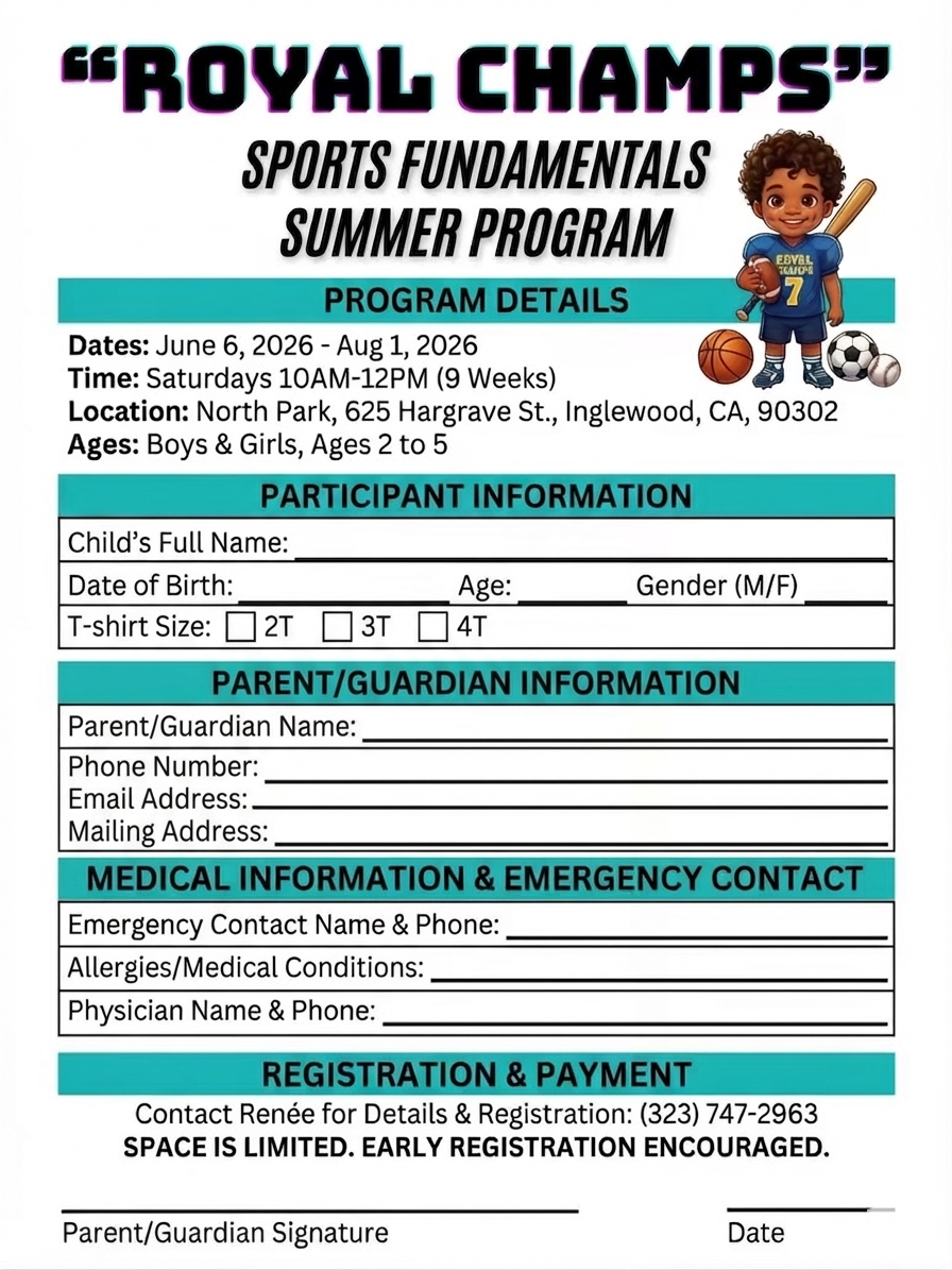 Our inaugural program runs from June 6, 2026, to August 1, 2026, every Saturday from 10 am to 12 pm. We focus on developing mobility, fine motor skills, critical thinking, and teamwork through football, basketball, soccer, and baseball fundamentals. Registration ends May 5, 2026